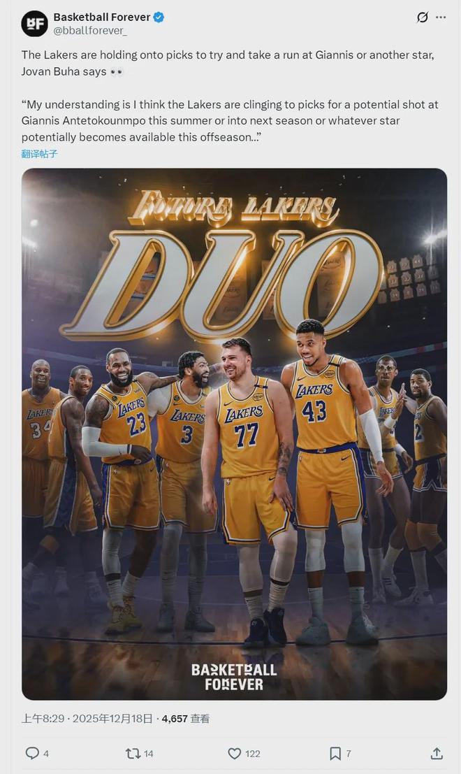 北京时间12月18日,据湖人队记者Jovan Buha报道,湖人队把目光聚焦在字母哥身上:“湖人队之所以手握2026年首轮选秀权,就是为了明年夏天追求字母哥。到时候,湖人队将拥有3个可以交易的首轮选秀权,先签下其他球员,再交易第一个球员的薪水。”明年夏天,湖人队将有四名年薪过千万的球员合同到期,分别是詹姆斯、八村塁、文森特和克莱伯。此外,里维斯拥有球员选项,可以在明年夏天选择跳出合同,与湖人队签订一份为期五年、价值2.4亿美元的续约合同。有球迷建议湖人队现在应该向里维斯提出报价。季后赛后降低里维斯的交易价值怎么样?问题是,如果湖人队本赛季提供字母哥,他们就只有两个首轮选秀权可以选秀。拉德。阿德托昆博的下一个最爱是尼克斯队。尼克斯队在大桥交易中送出了5个首轮选秀权,目前只剩下2个首轮选秀权可以交易。字母哥交易市场并不像听起来那么火热。 NBA记者Marc Stein报道称,马刺、火箭和雷霆目前没有追逐字母哥的计划。他们对自己目前的状况很满意。雄鹿队正在尽一切努力说服阿德托昆博留在球队。雄鹿队想要追逐国王队的拉文和开拓者队的格兰特。说起湖人队和字母哥,里维斯出生于1998年5月29日,本赛季他为湖人队出战了21场比赛,全部都是首发。场均上场36.9分钟,得到27.8分5.6篮板6.7助攻1抢断3.3失误。他的三项命中率分别是:50.3%、36.9%、87.5%。里维斯现在的交易价值很高。字母哥出生于1994年12月6日,本赛季在雄鹿队首发17场。场均出场29.1分钟,得到28.9分、10.1篮板、3.1助攻、0.9抢断、0.9盖帽、3.3失误。他的三项命中率分别是:63.9%、43.5%、63.5%。字母哥仍在养伤中,目前还没有复出的时间表。媒体普遍认为字母哥“伤势小但进步大”,雄鹿在交易中是保护他。最后一个问题:你认为湖人队需要采取什么样的行动才能打动雄鹿队?