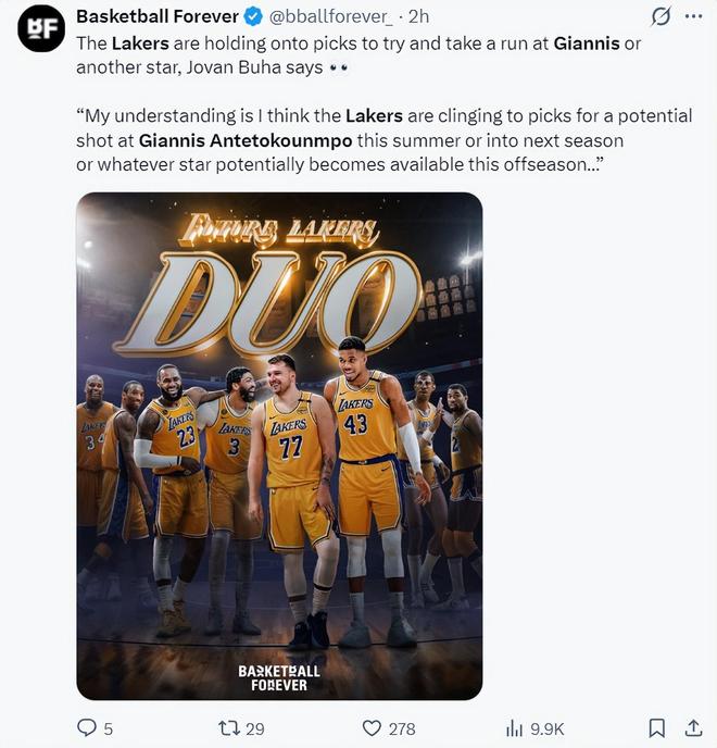 北京时间12月18日,湖人队TA记者乔什·布哈在播客中表示,湖人队计划瞄准字母哥。他们保留 2016 年的首轮选秀权,以便在 2026 年夏天追逐扬尼斯,或者在休赛期追逐扬尼斯这样的球星。随后美媒Hoops写道:虽然湖人队老板马克沃尔特非常希望看到东契奇和约基奇联手,但湖人队也有望尝试得到字母哥。大家应该注意到,湖人队不会在这个交易截止日期之前追求扬尼斯,因为扬尼斯本赛季很可能会留在球队。湖人队的目标是2026年夏天,我们称之为休赛期,因为此时湖人队有3个首轮选秀权可以交易,湖人队的薪资空间得到了前所未有的释放。当詹姆斯的5262万合同在2026年夏天到期时,里维斯将选择退出他的1439万球员选项。如此一来,湖人队将获得大约6700万的薪资空间。湖RS也将与里维斯一起达到五年2.87亿的超级顶薪,那么里维斯将成为字母哥最好的交易筹码。 LAL湖人媒体Playoff分析了湖人与扬尼斯交易的具体细节,先签下里维斯,然后交易,因为这是平衡扬尼斯5840万合同的唯一方法。第一步:与里维斯续约五年2.87亿;第二步:送出里维斯、八村塁、3个未来首轮选秀权、3个首轮互换权、1个次轮选秀权;这样一来,湖人就可以得到字母哥,打造字母哥+东契奇的巅峰超巨组合。当然,这对湖人媒体来说是最理想的情况,因为扬尼斯这样的sA巨头肯定会得到多支球队的报价。也许其他球队的报价对雄鹿队更有吸引力?